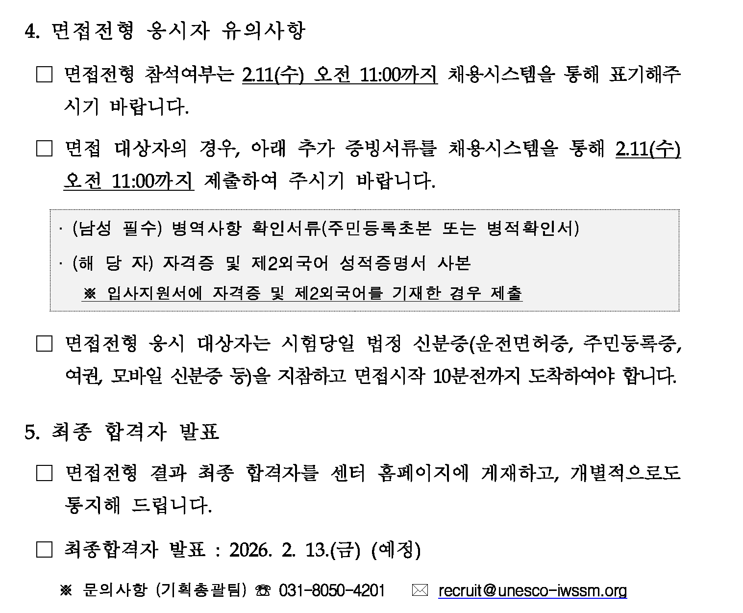 PrevList (2026-1) 기간제 계약직 채용 필기전형 합격자 발표 및 면접전형 시행 공고 ADMIN 2026.02.06 18:02:03 | 15 Attached File (2026-1)_필기전형_합격자_발표_및_면접전형_시행_공고_260206.pdf 본문 ▶ 채용 홈페이지 바로가기 ◀ 이 글을 SNS로 보내기