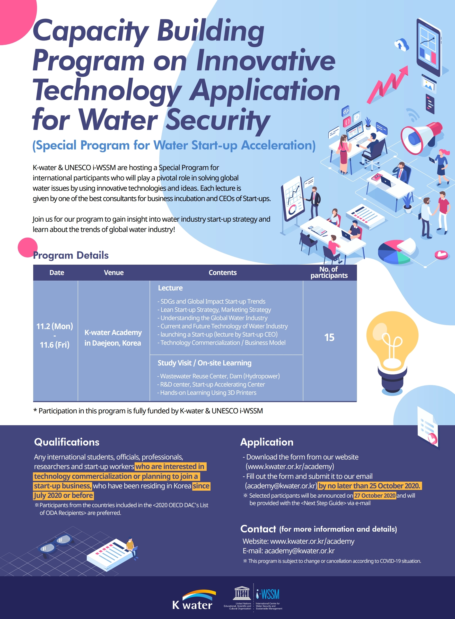 Please refer to the attached files of program information, application guidelines, and application form. If you are interested in the program, please submit the application form and send it to K-water email(academy@kwater.or.kr) no later than 25 October 2020.